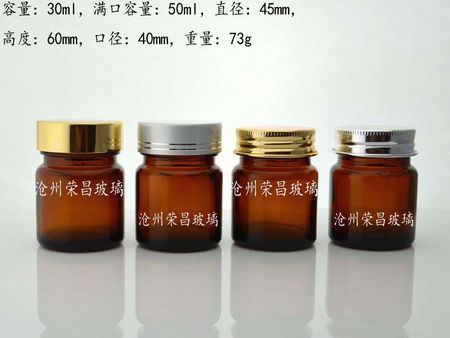 30ml棕色廣口玻璃瓶,適用于承裝各種片劑,膠囊,膏劑等,瓶型美觀大方,搭配高檔鋁蓋。標(biāo)稱容量:30ml,滿口容量:50ml,直徑:45mm,高度:60mm,口徑:40ml,重量:73g。
